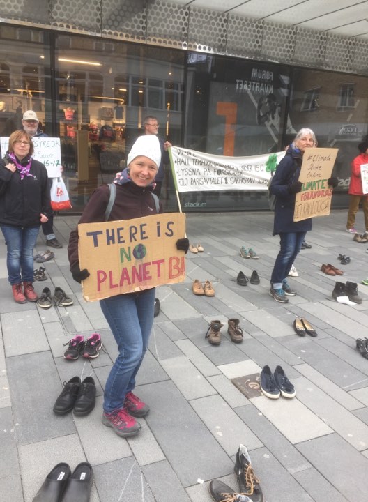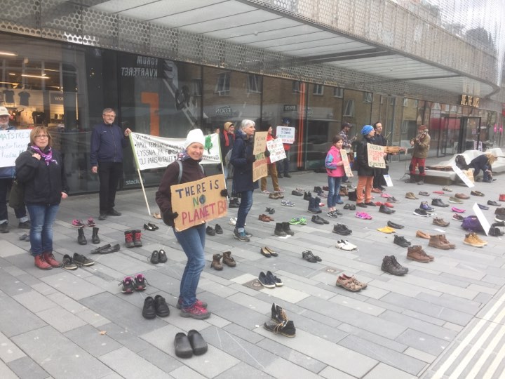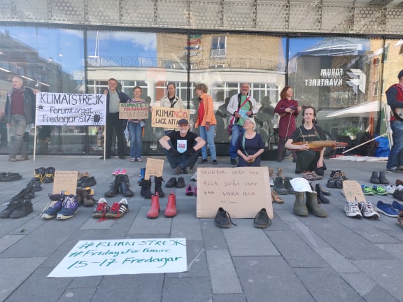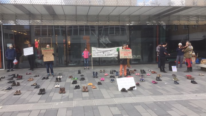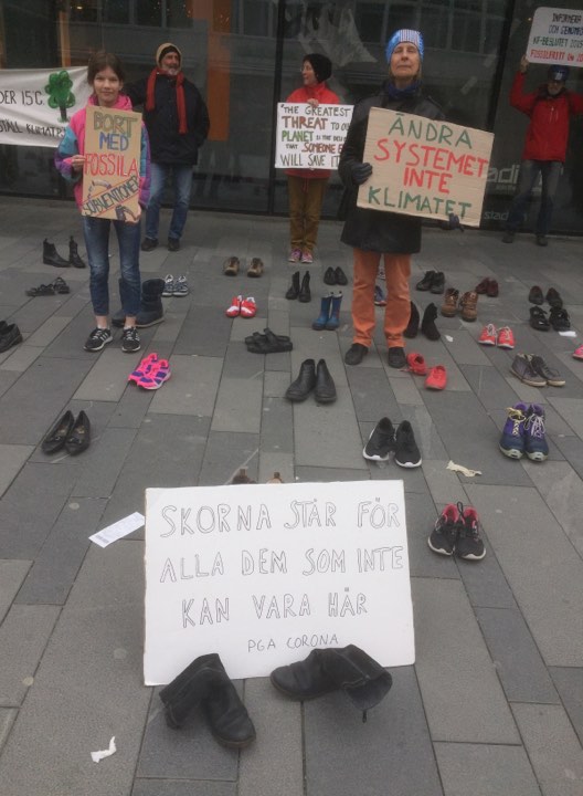 Den 24 april skulle det ha vart en stor global klimatstrejk med stor manifestation på Forumtorget. Nu blev det i stället en stor skostrejk där varje par skor representerar en person som strejkar hemma/digitalt.
